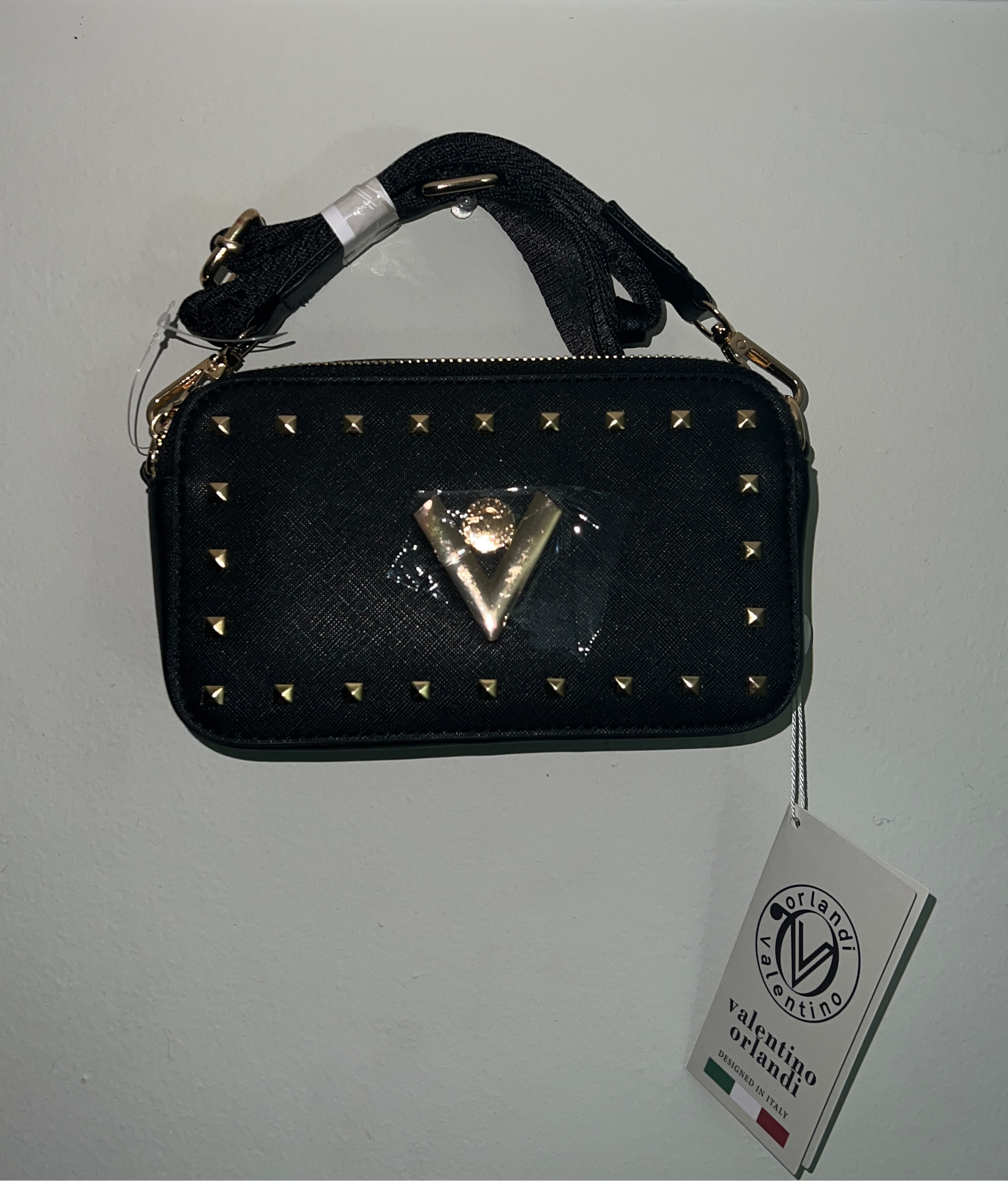 Add a touch of bold elegance to your look with this Valentino Orlandi black studded crossbody bag, crafted from 100% premium Italian leather. Designed for fashion-forward individuals, this compact handbag features a sleek structured silhouette, gold-tone pyramid studs, and the signature Valentino Orlandi emblem for a luxurious touch. The adjustable strap offers versatile styling, making it perfect for both casual outings and evening events. Elevate your wardrobe with this must-have statement piece—